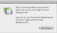 Once you are done either log out or use fast user switching (which isn't that fast on my Macbook Pro) and you will see you cool new login background. You can change this as much as you want. As you can see I have changed mine to a fantasy theme below. At this point I was going to include another tip for taking a picture of your background but it didn't work. I had to use my camera.