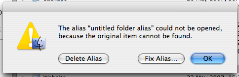 The first step is to create a temporary folder where you want the Alias to be. For example in your documents folder. This will bring you up with an alias of that temporary folder.The next step is to delete the temporary folder you used to create the alias. You now have a "lost" alias.